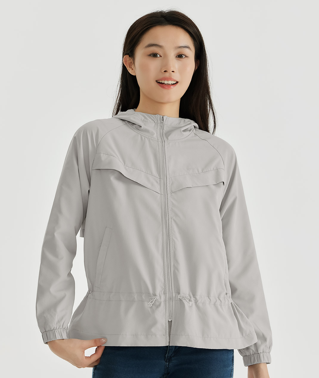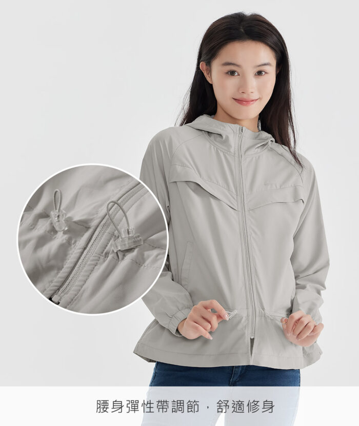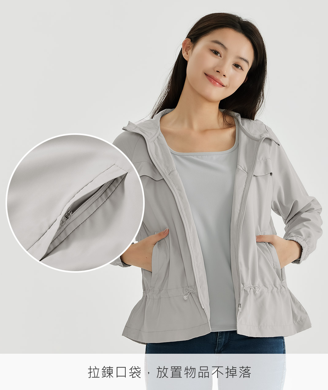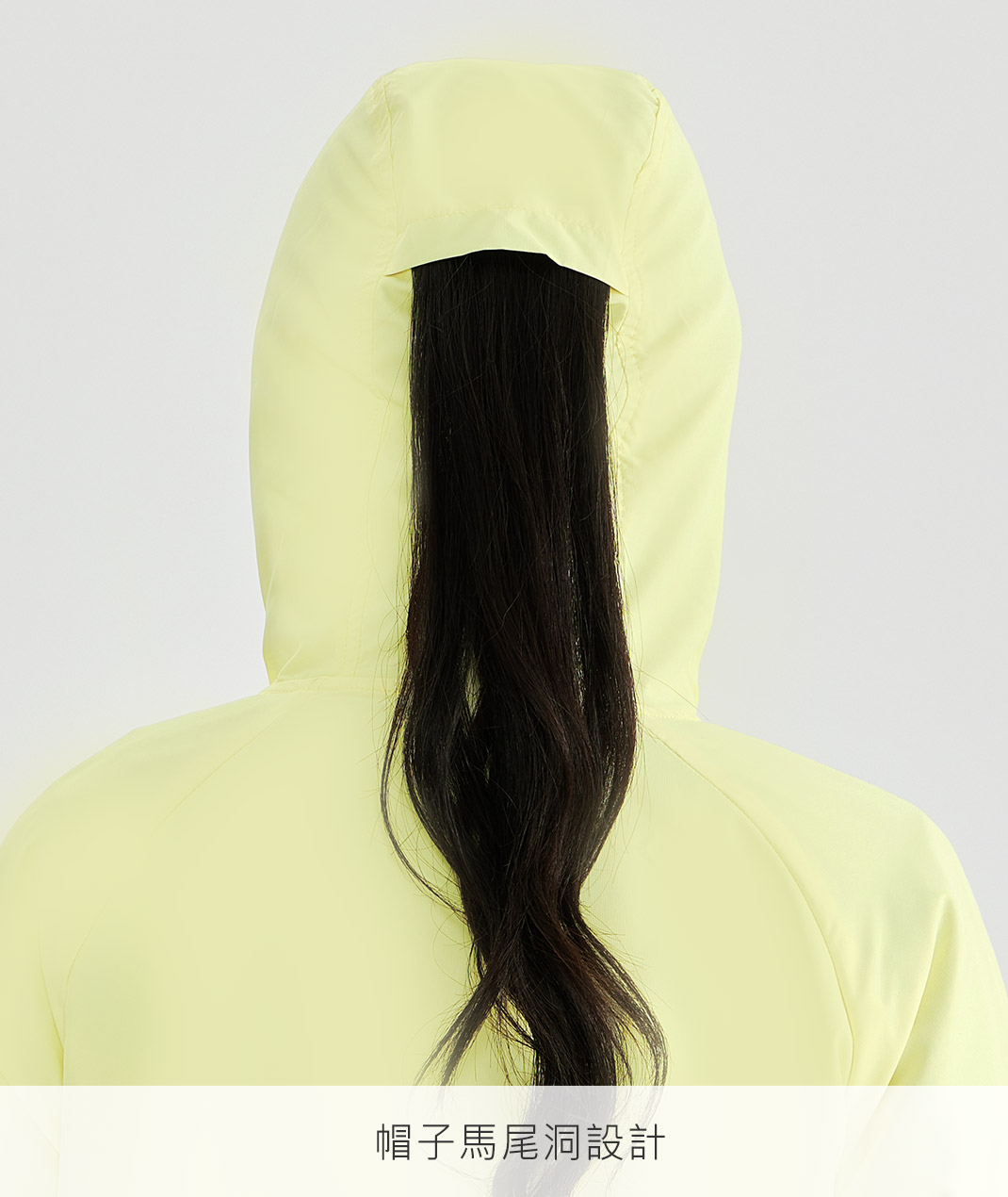 - 抗UV環保防潑水外套,高機能布料防潑水防風隔濕,輕便透氣,穿著乾爽舒適。背部透氣開口與馬尾洞設計,抽繩收腰修飾身形,環保製程兼具機能,適合露營健行與日常穿搭。