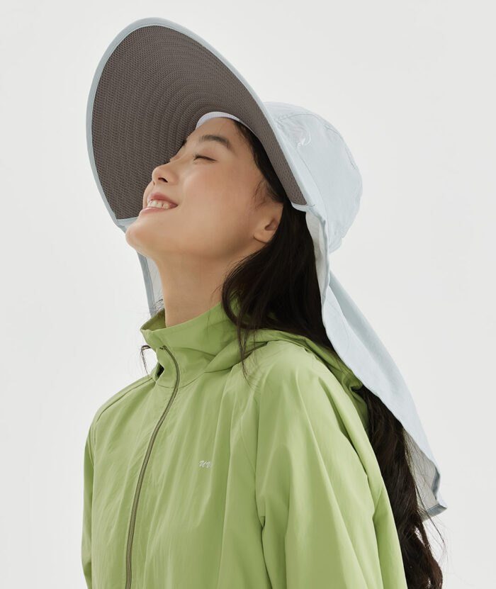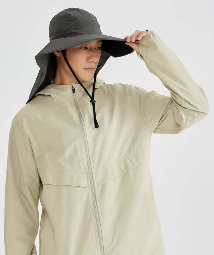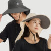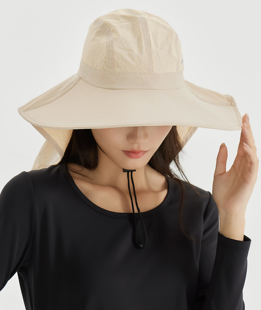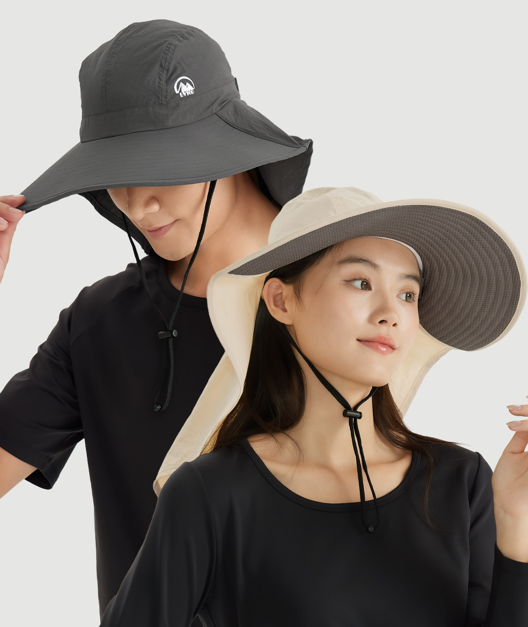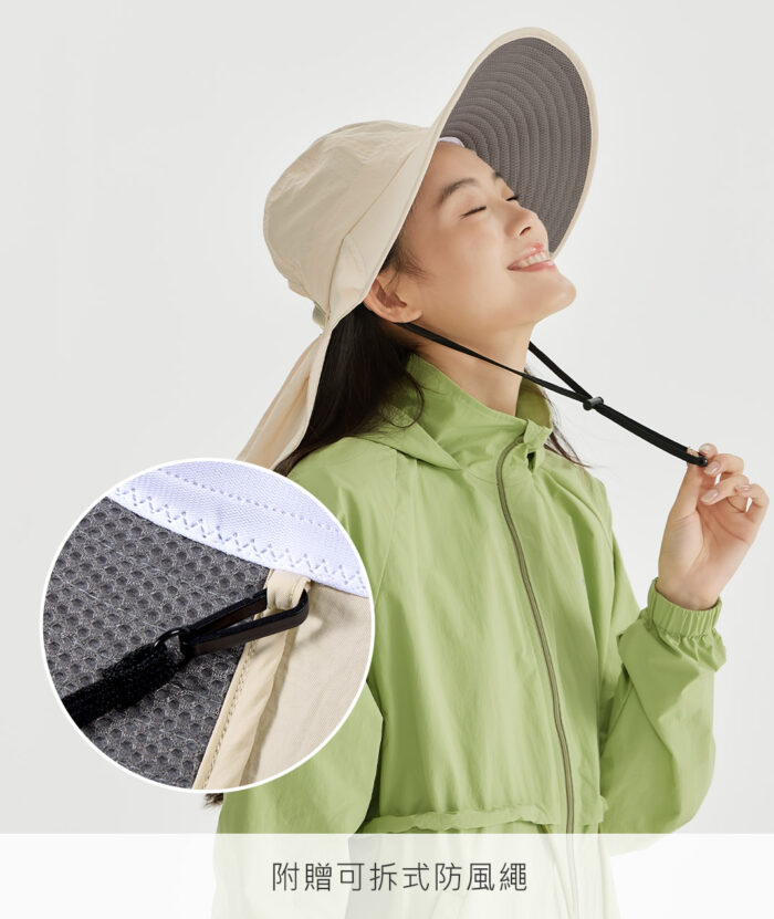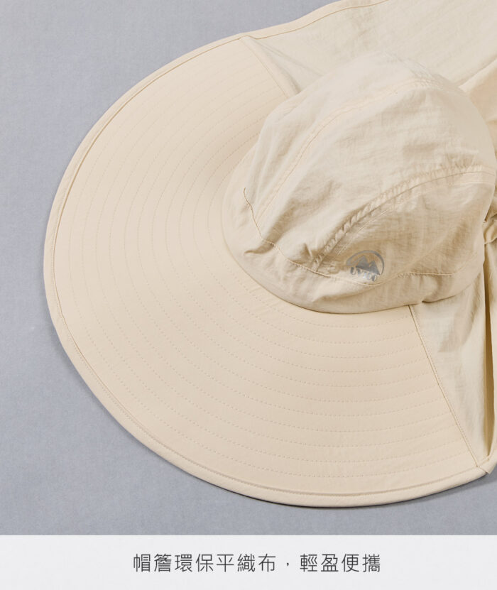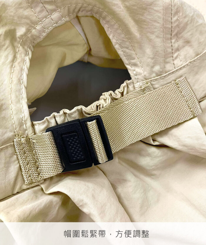 - 這款採用環保超潑水布料製成,輕盈透氣不悶熱。大帽簷抗UV,有效遮陽防曬,附可拆防風繩與鬆緊頭帶,配戴穩固便利。無論旅行或戶外活動,都能給予舒適防護。