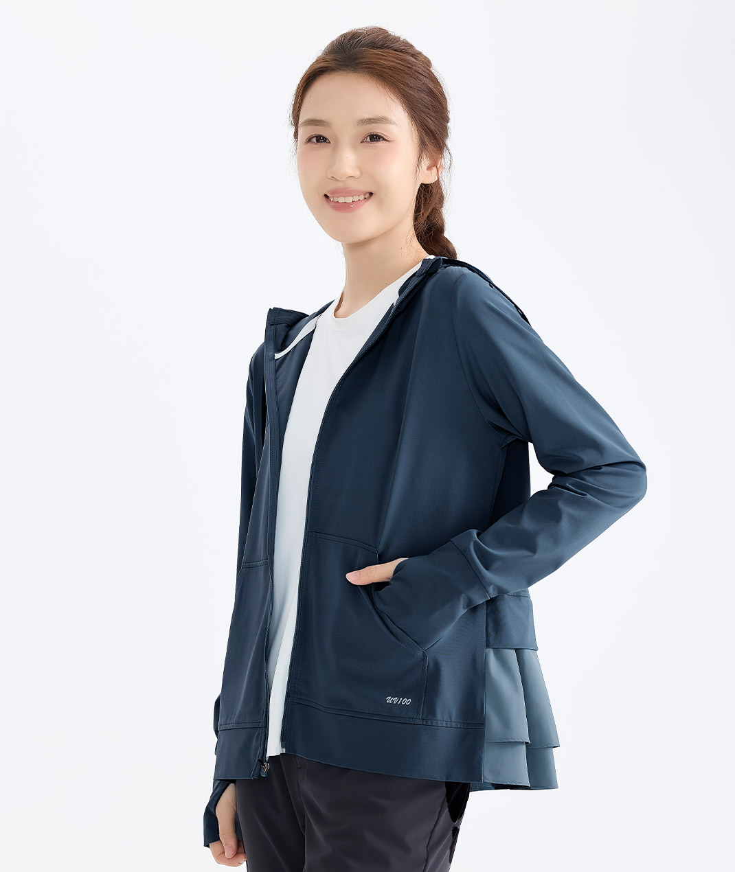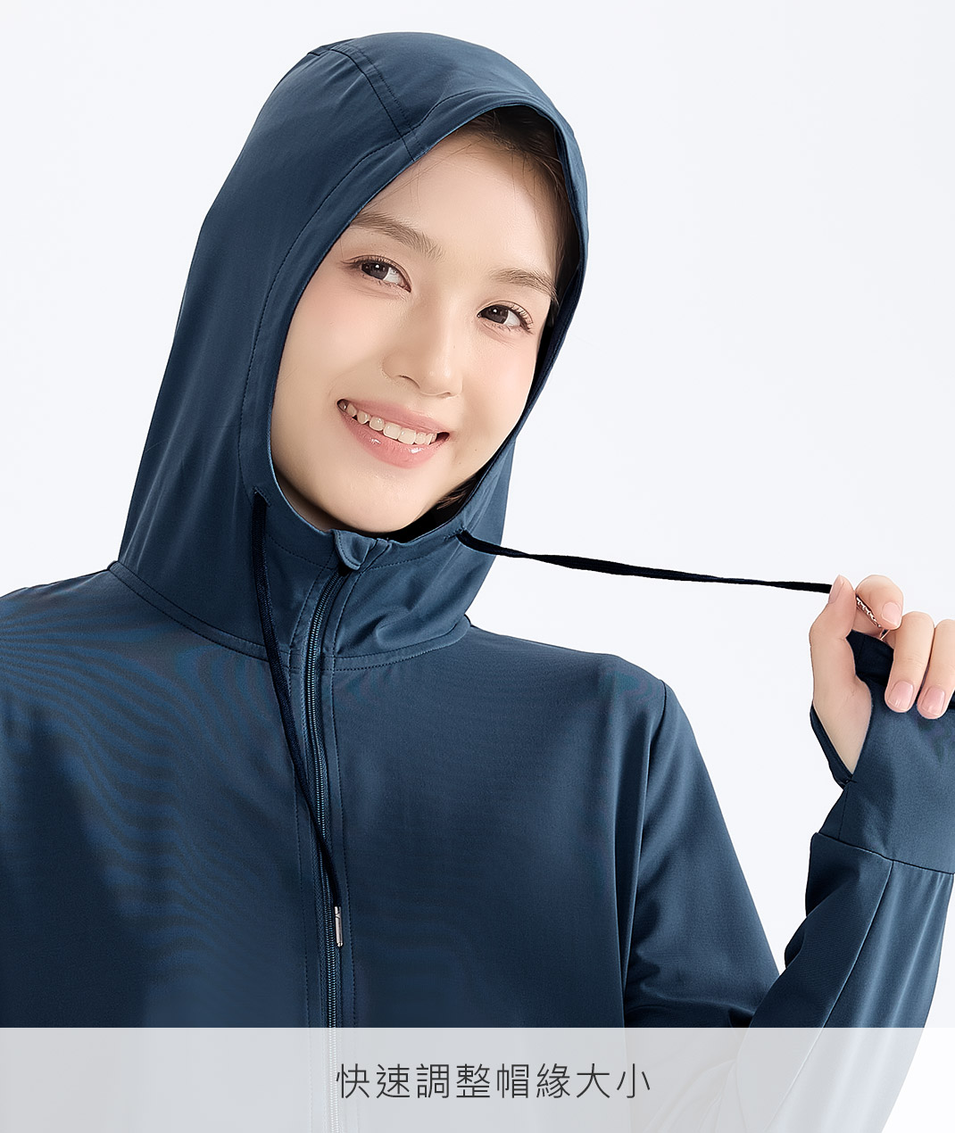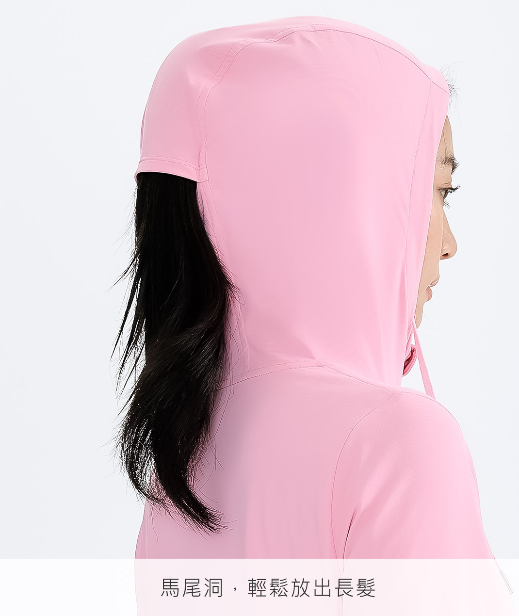 - 連帽設計搭配涼感彈性布料,穿著輕鬆好活動;吸濕速乾不悶熱,抗UV防護提升安心感。波浪下襬修飾線條,馬尾洞不壓髮;指洞剪裁,兼顧手背防曬,通勤踏青都適合。