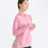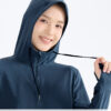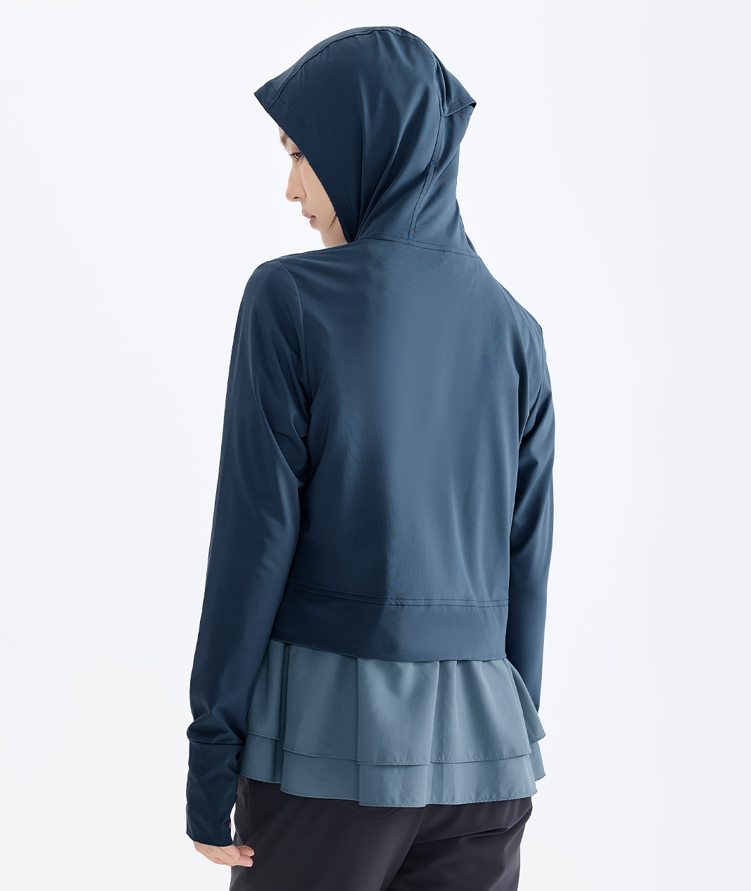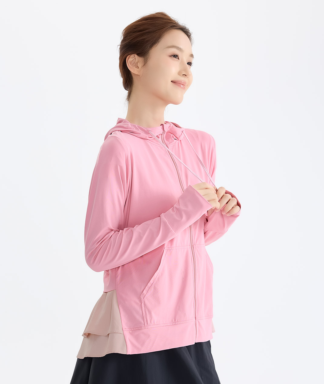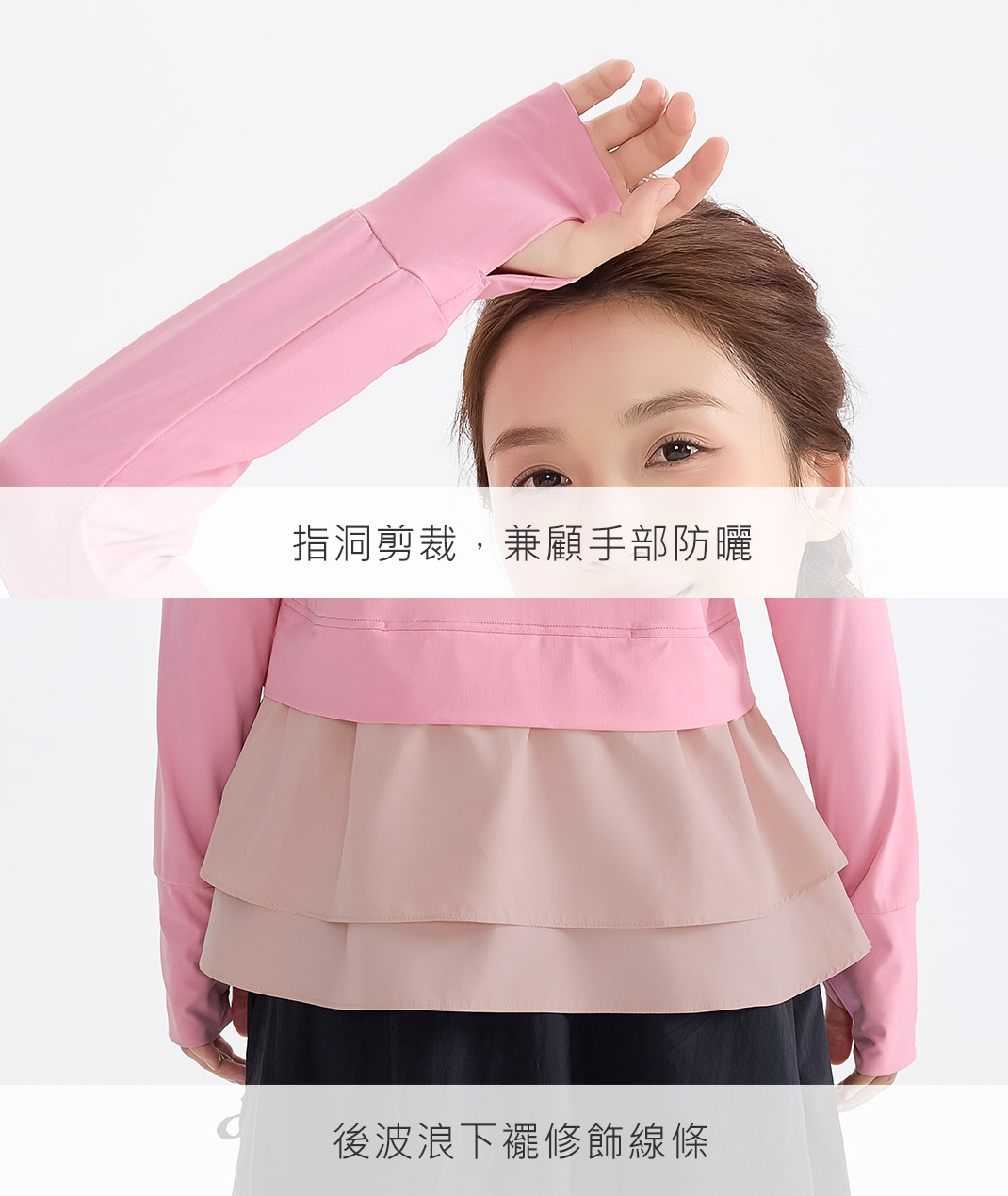 - 連帽設計搭配涼感彈性布料,穿著輕鬆好活動;吸濕速乾不悶熱,抗UV防護提升安心感。波浪下襬修飾線條,馬尾洞不壓髮;指洞剪裁,兼顧手背防曬,通勤踏青都適合。