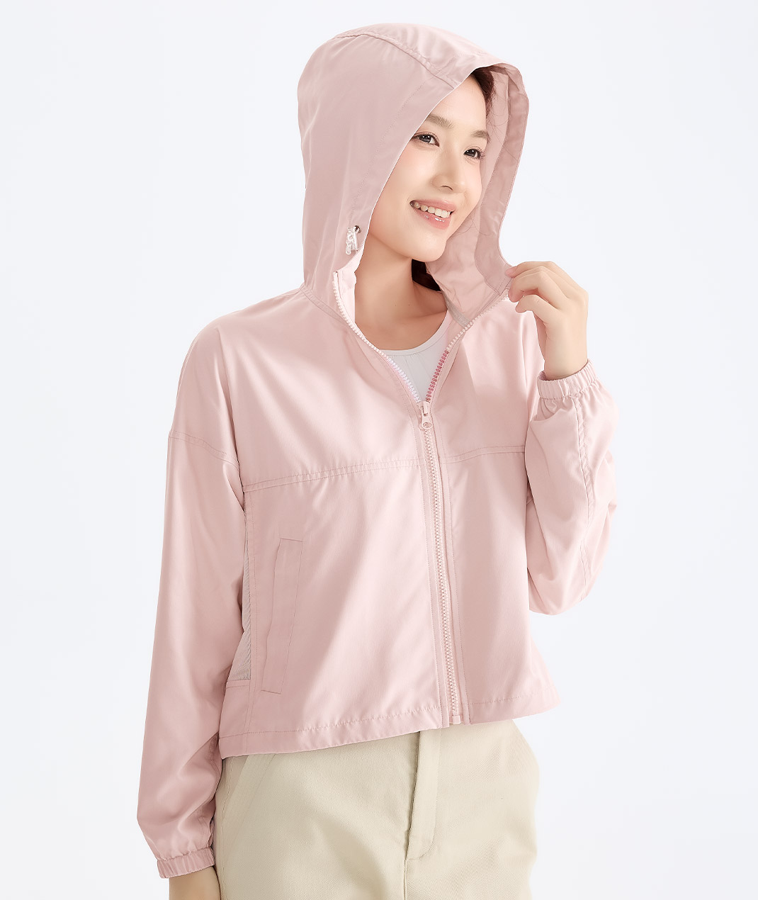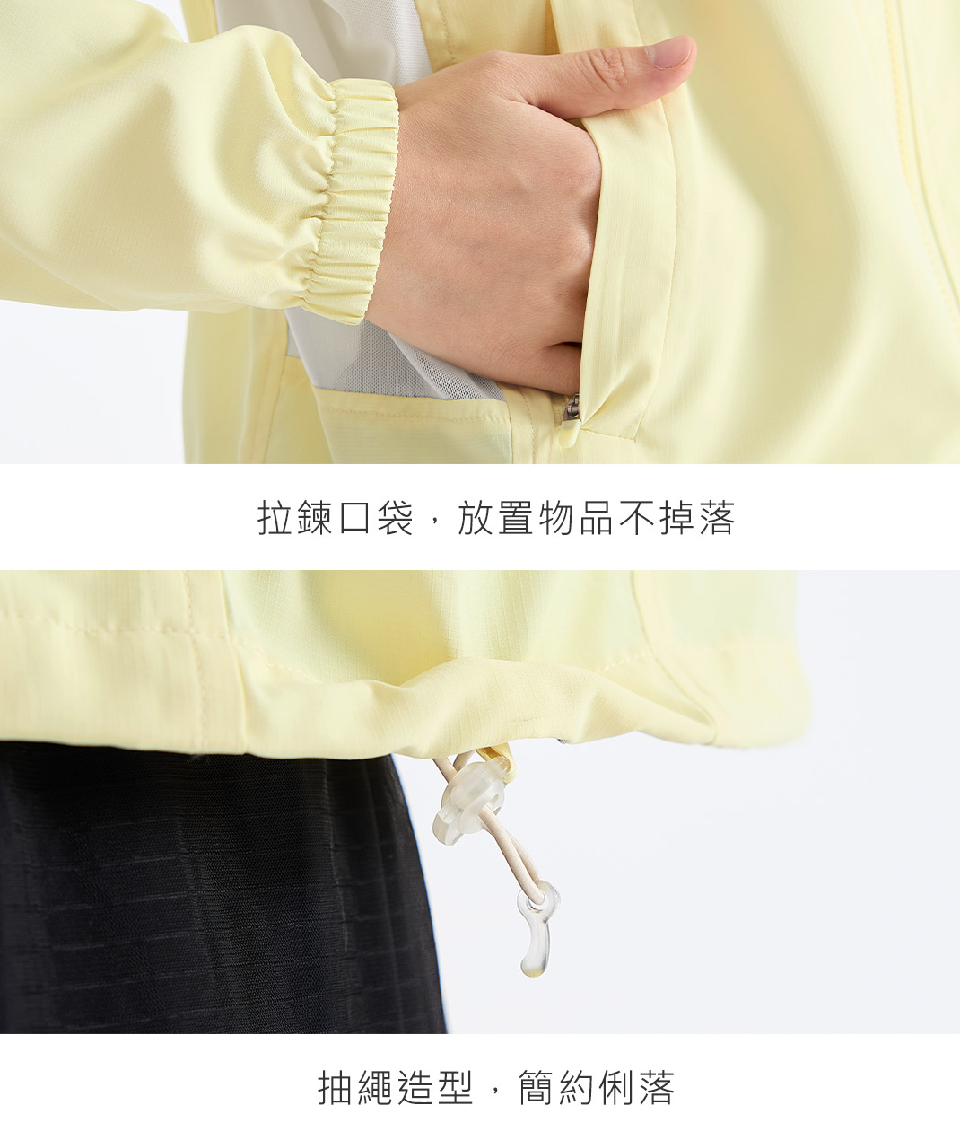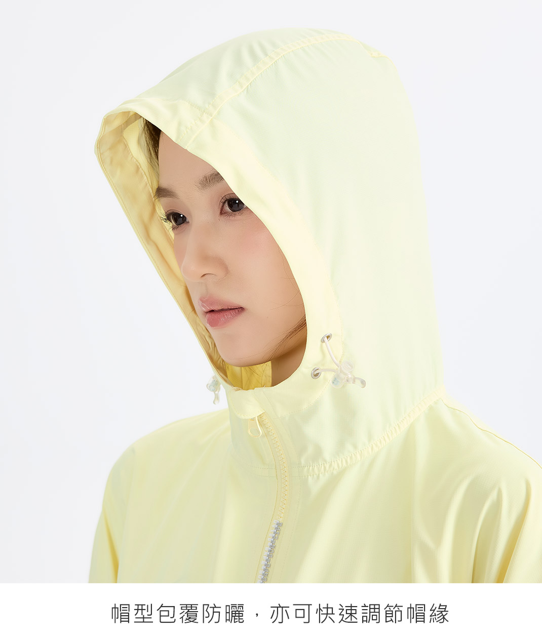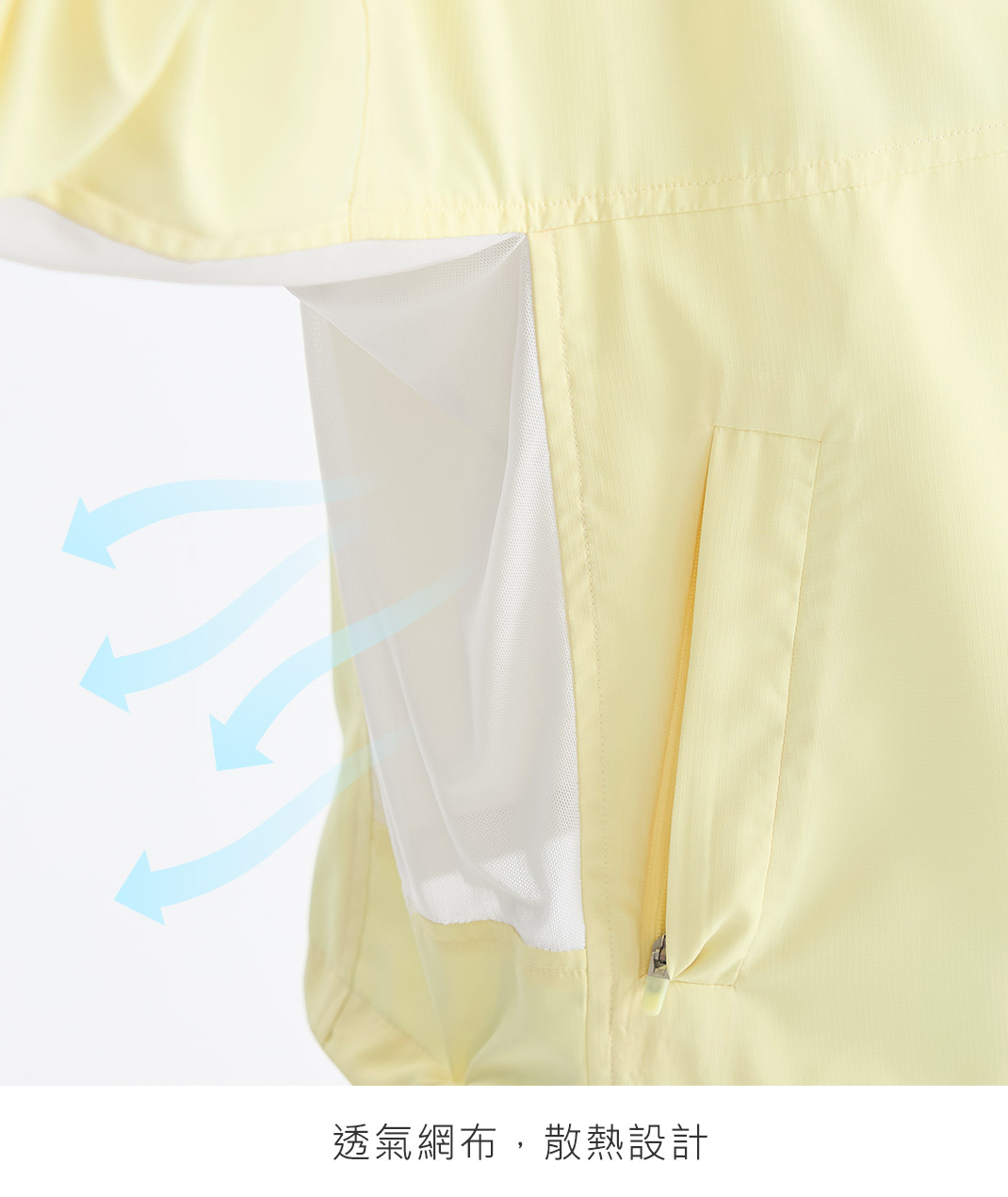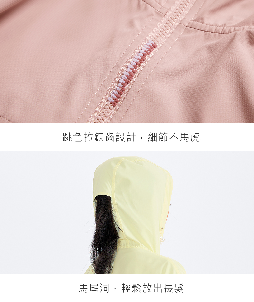 - 連帽立領設計,涼感吸濕速乾輕量布料,具備UPF50+強效防曬。拉鍊口袋安心收納小物,造型拉鍊齒與透氣網布增添休閒感;馬尾洞輕鬆放出長髮,日常通勤到度假都好搭。