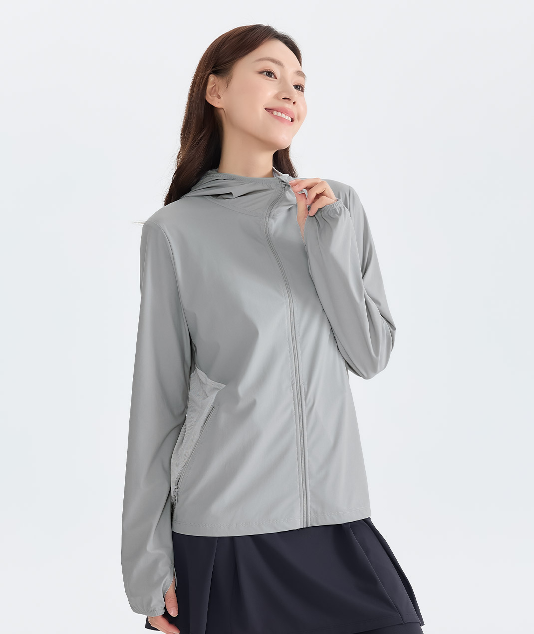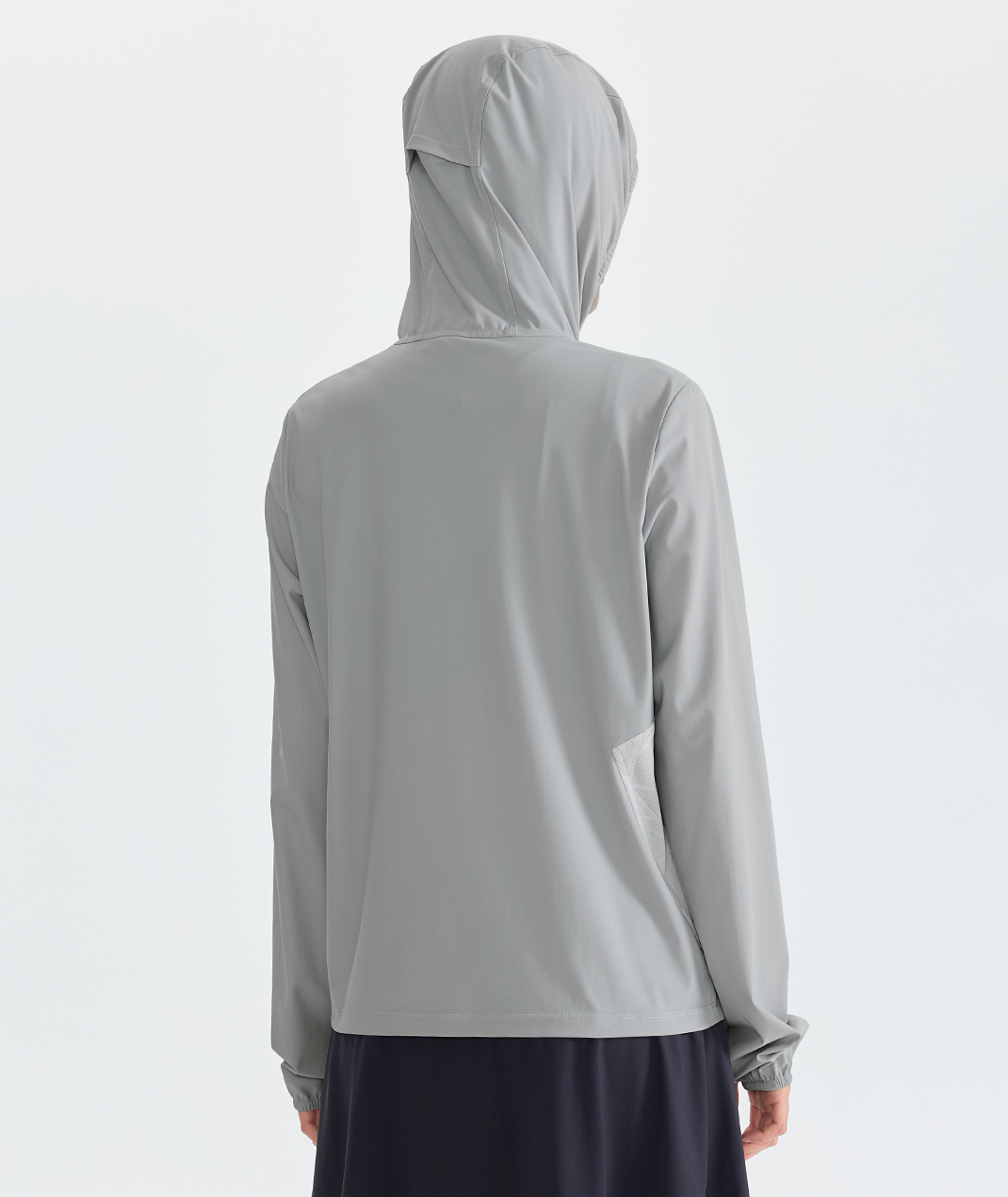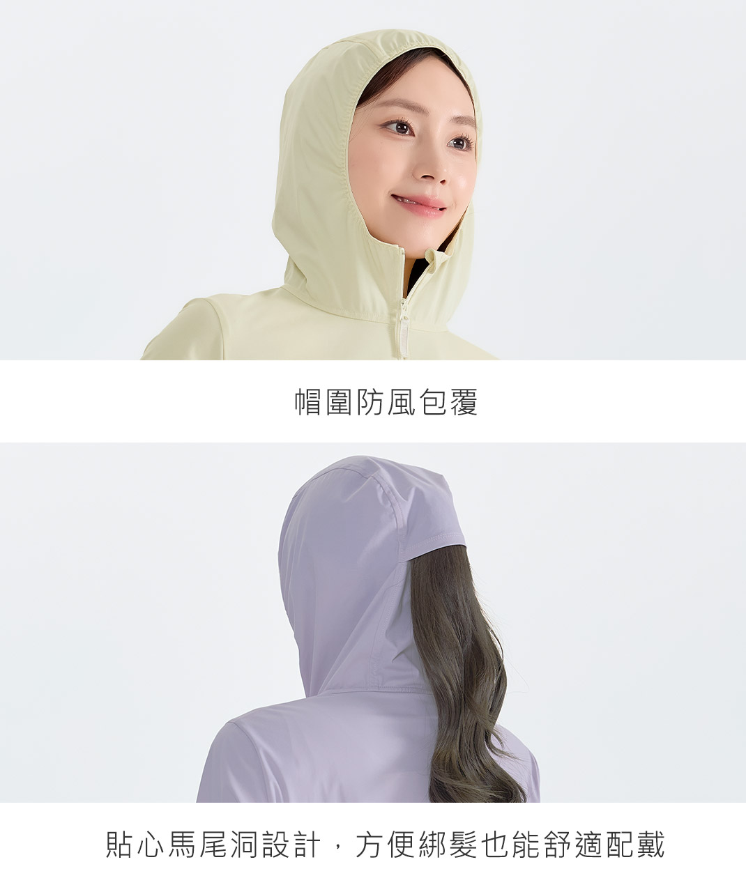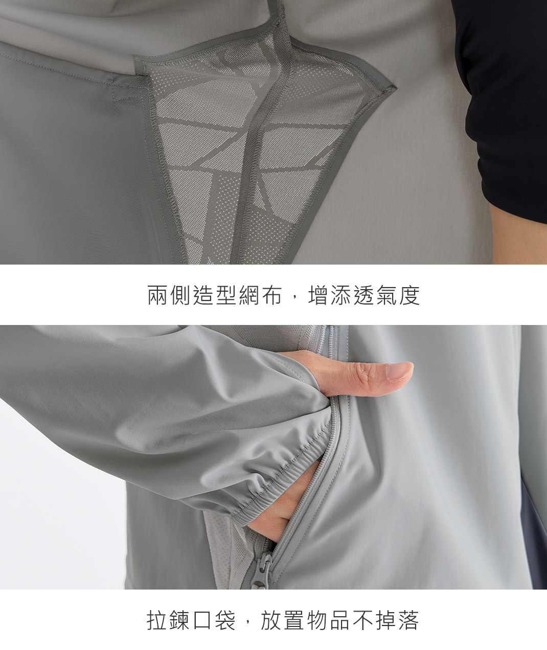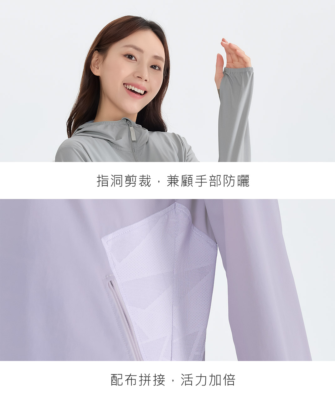 - 抗UV外套具 Q-Max 0.236 涼感與吸濕速乾,網布拼接透氣加倍。馬尾洞與指洞設計完美防護,抗菌減味不悶熱。適合慢跑、健行與日常休閒,穿出俐落修身比例。