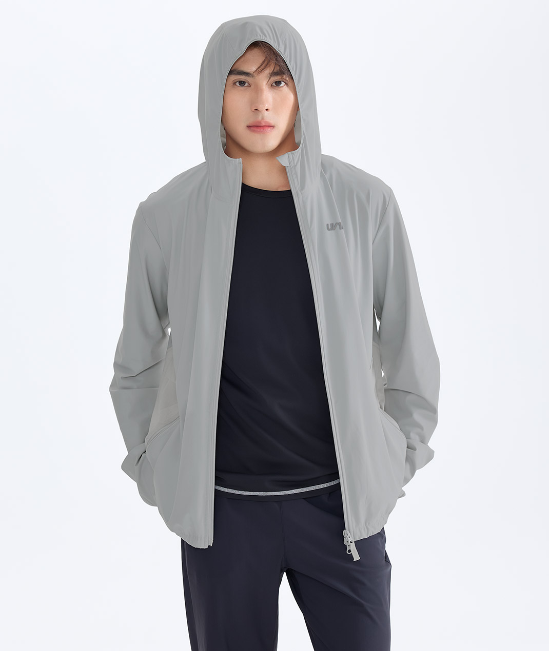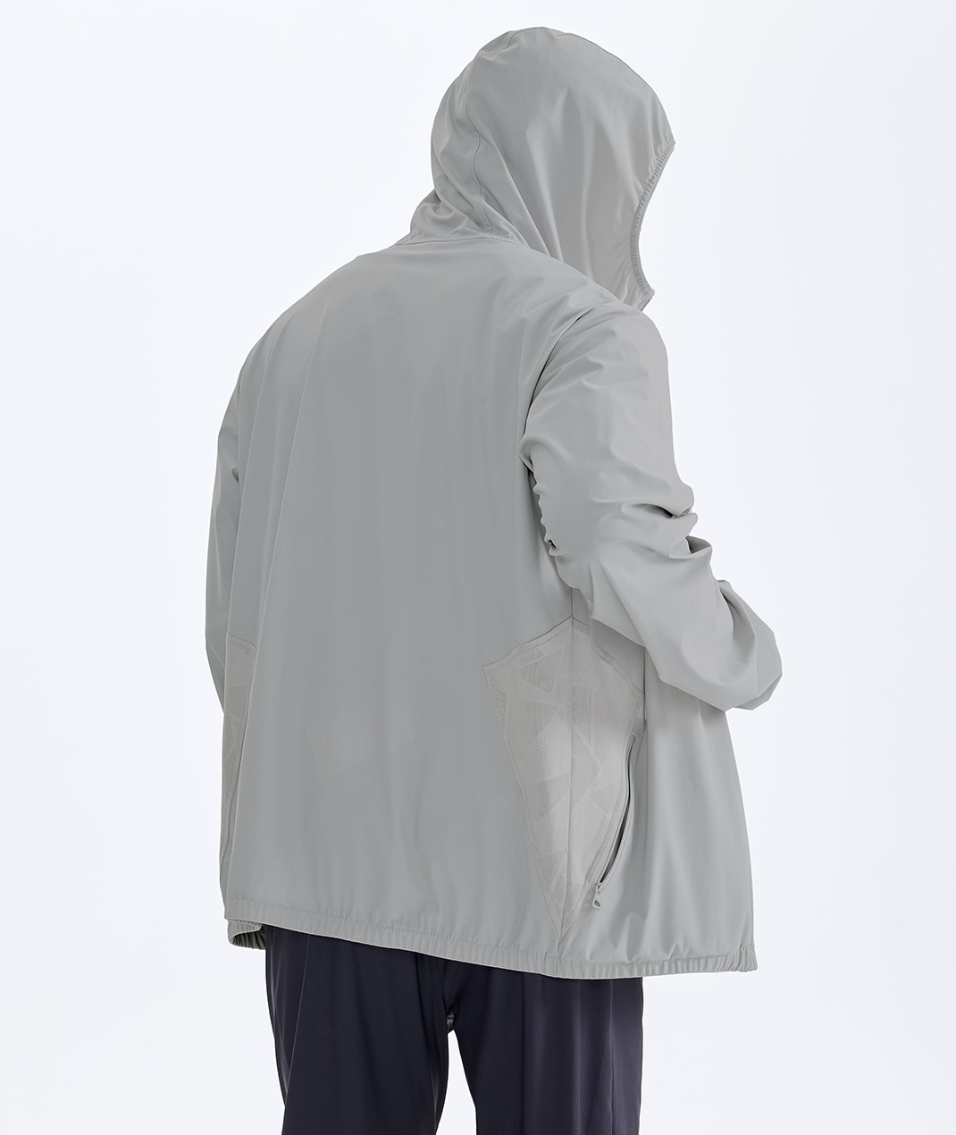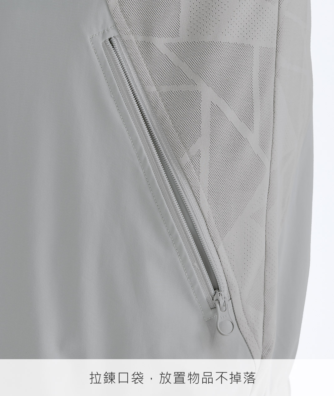 - 冰織彈性針織親膚涼感,幾何提花網布拼接透氣提升,告別悶熱黏膩。排汗速乾加抗UV,連帽縮口俐落版型;抗菌減味穿久更自在,變色副料點亮細節,運動日常都好搭。