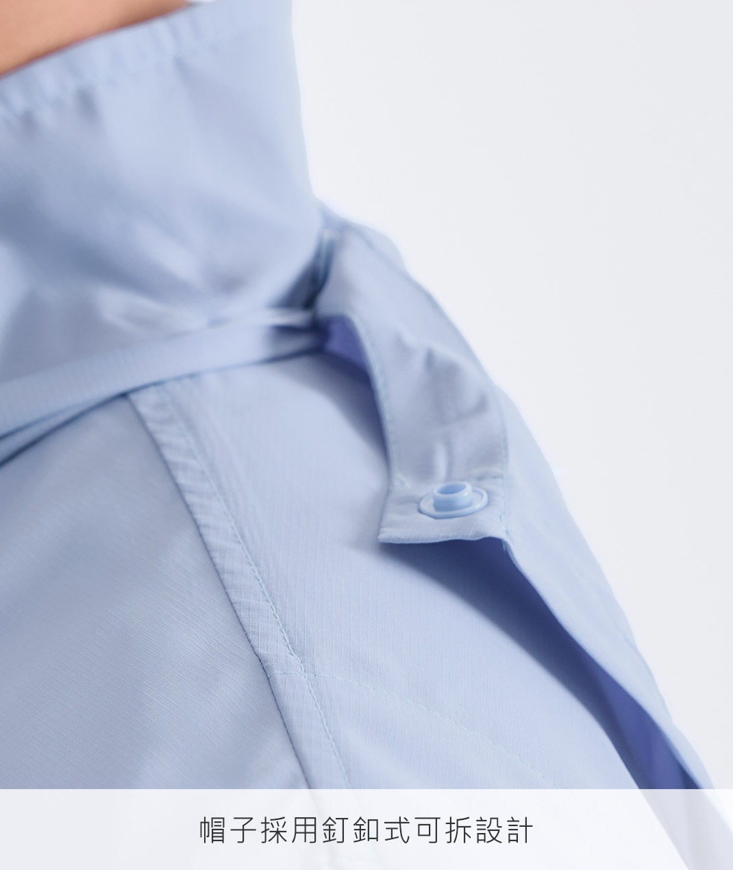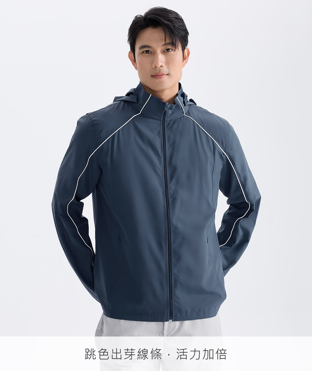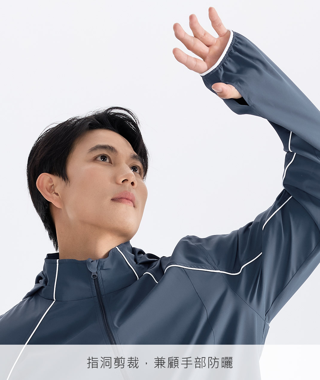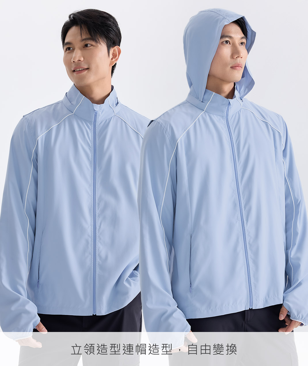 - 一件搞定兩種造型:帽子釘釦式可拆,立領和連帽隨心切換。流線剪接搭配跳色出芽線條,穿起來更俐落有精神;指洞剪裁兼顧手部防曬,清涼好活動,通勤到戶外都好穿。