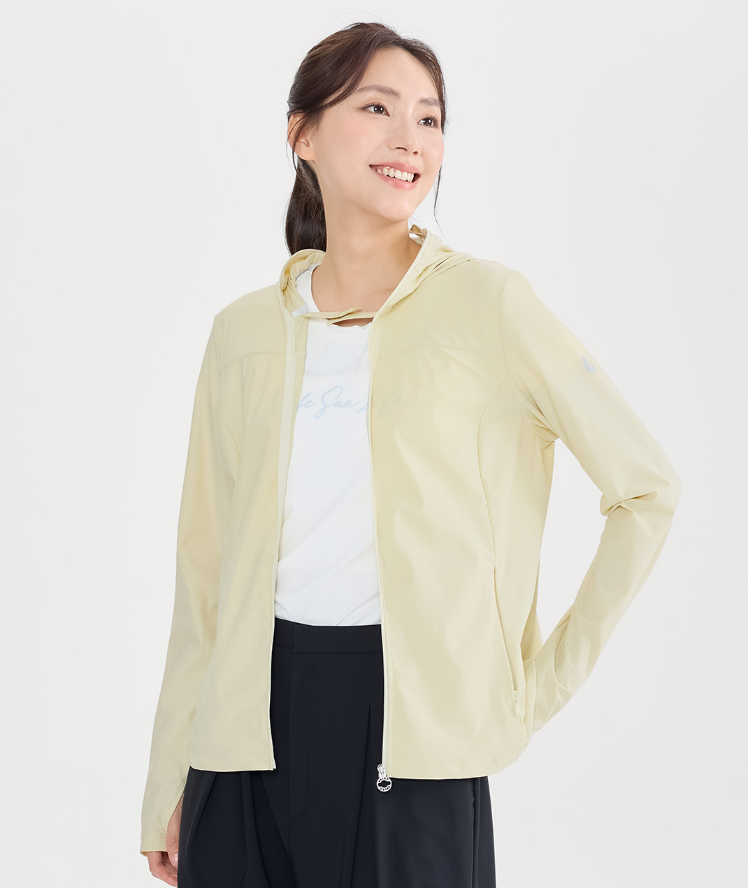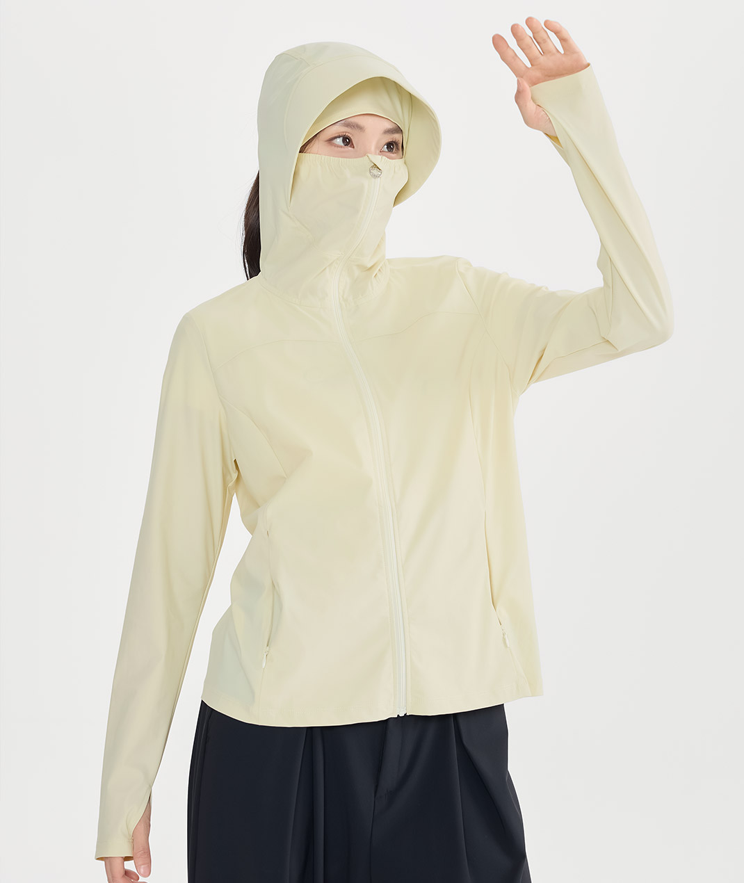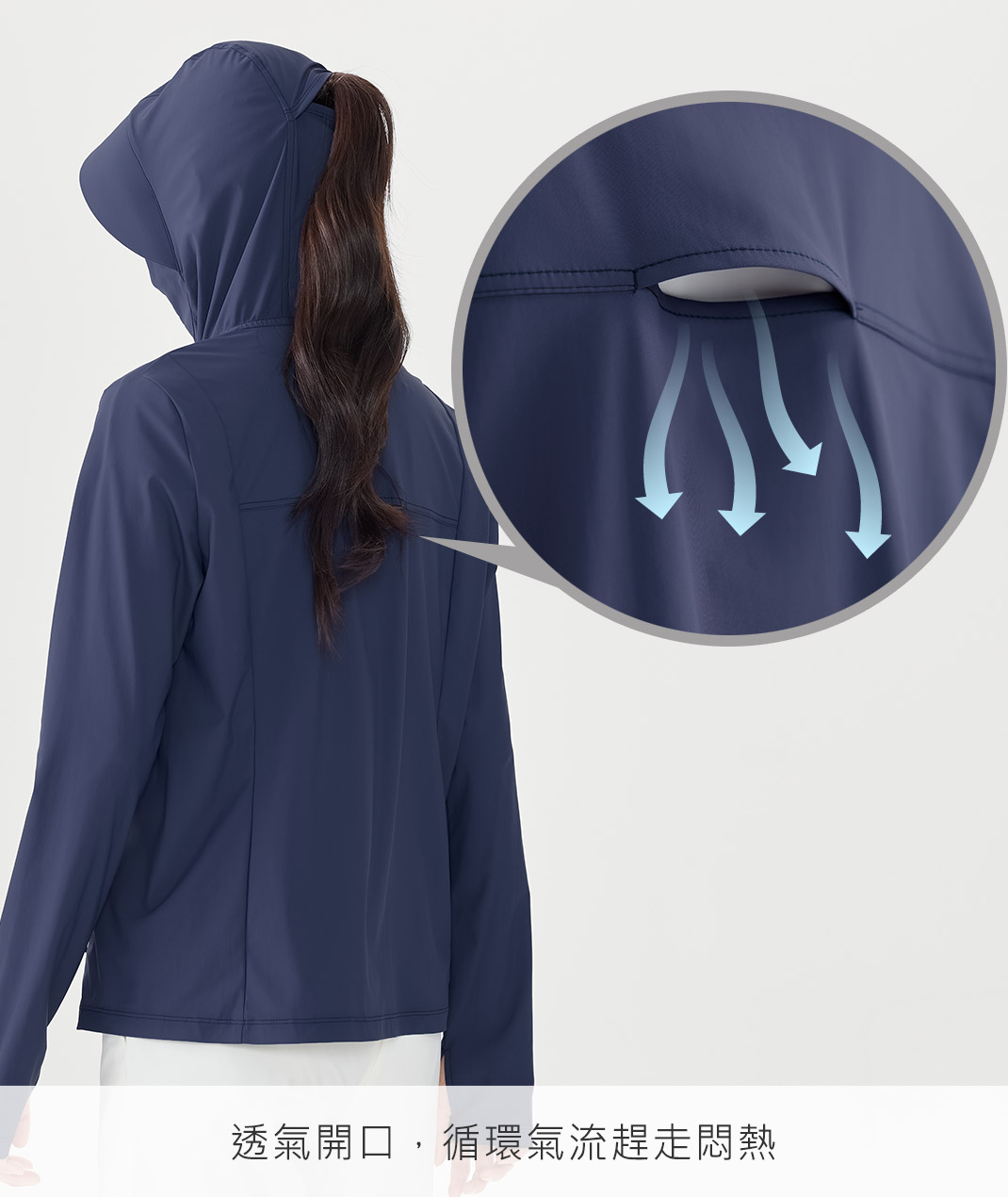 - 把防曬、口罩與外套合在一起,領口拉起就能全臉防護,臨時出門更方便。背後透氣孔透氣提升,告別悶熱黏膩;馬尾洞不鼓,拇指洞護手背,涼感排汗速乾抗UV,穿著更清爽。