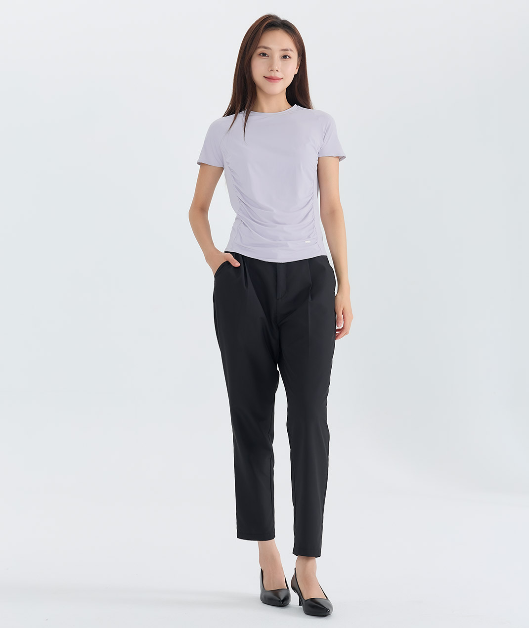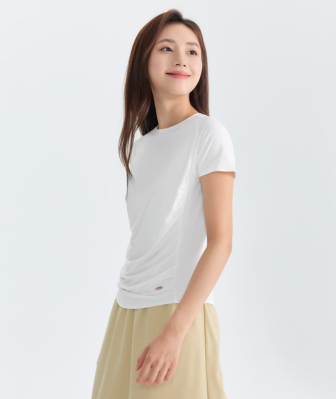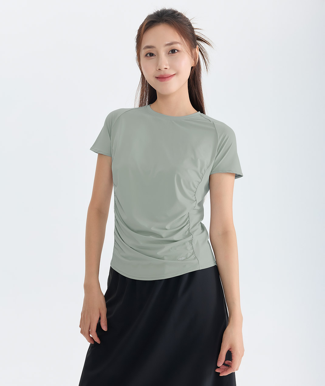 - 超涼感彈性布料,抗菌速乾、透氣舒適。連袖剪裁,方便活動;腰身造型剪接,柔美曲線,簡潔百搭,適合夏日通勤、運動與日常穿搭。