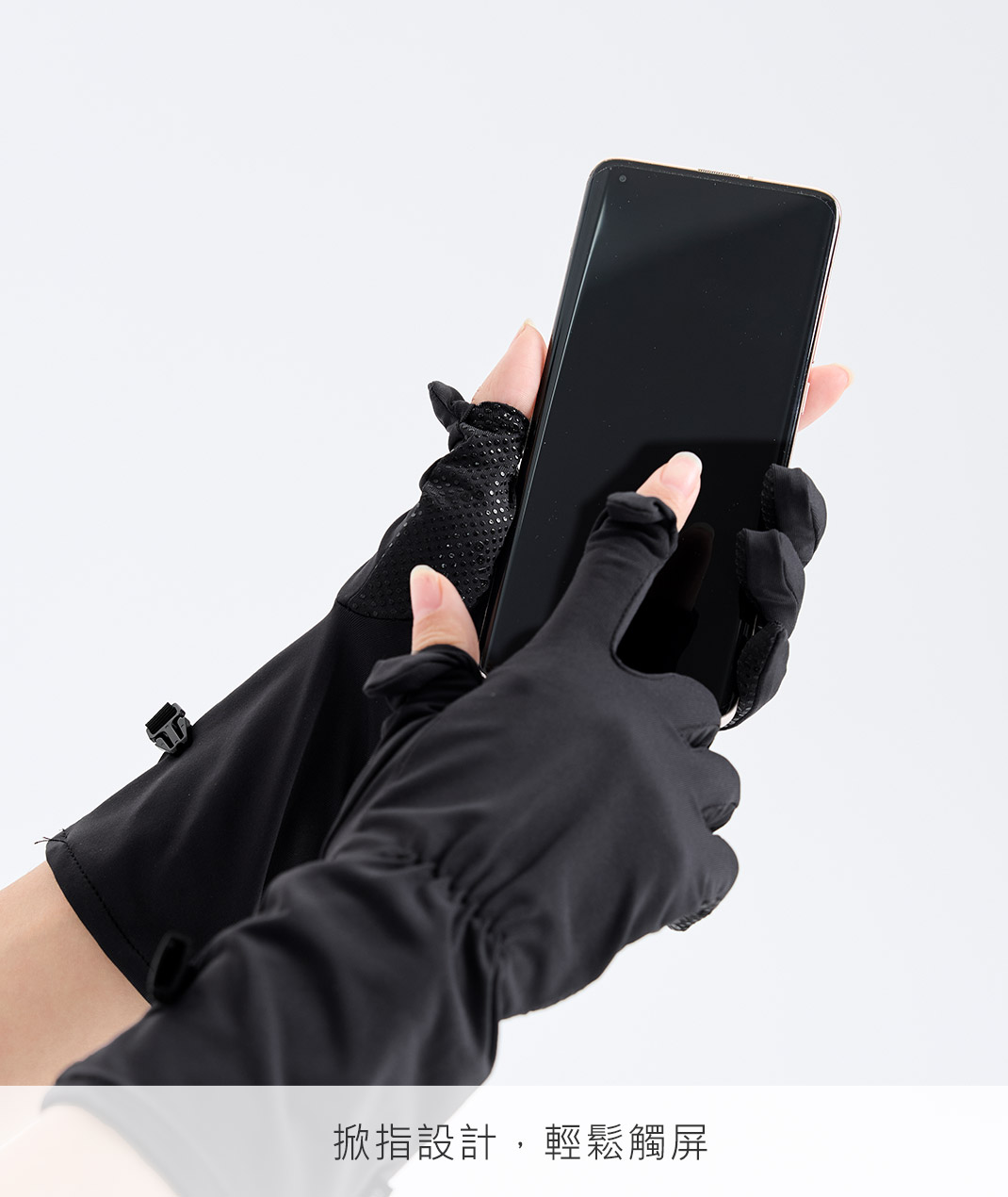 - 不想戴手套就卡手?高彈中長版貼合手型,掀指一秒觸控手機,掌心止滑更好握機車把手;涼感吸濕速乾,流汗也不黏。防丟釦環固定收納,抗UV抗菌,通勤更輕鬆