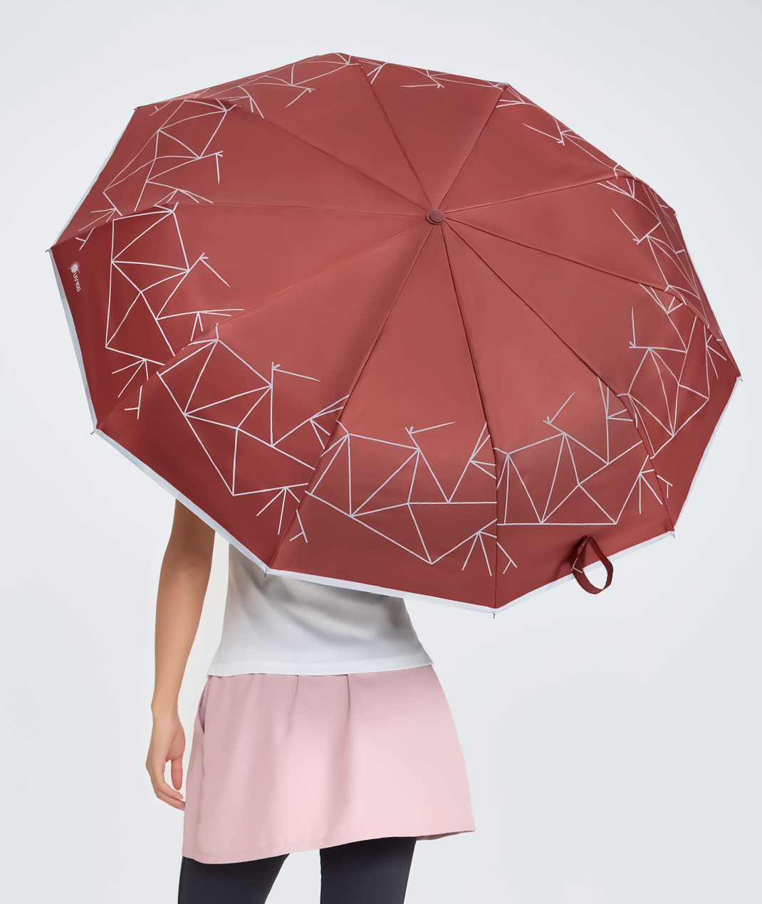 - 此款抗UV晴雨自動傘,簡約幾何圖案和超大傘面,提供全面遮蔽,邊緣反光增加雨天安全。堅固設計,抗風耐用,配有方便掛勾的傘柄,輕鬆掛置。兼具實用與美觀,無論晴雨皆適合使用。