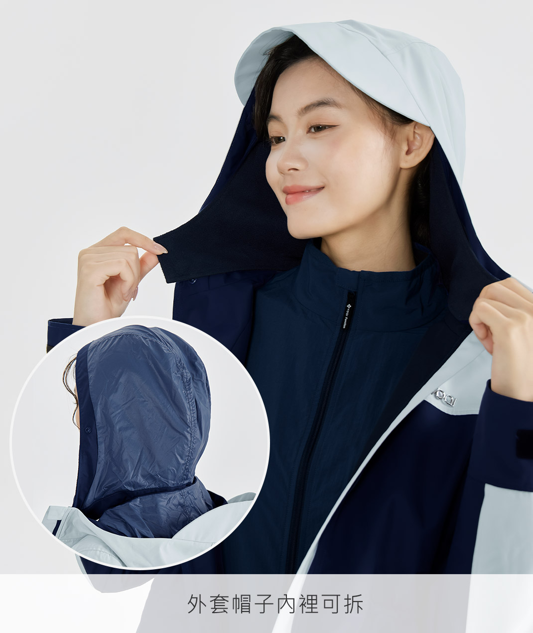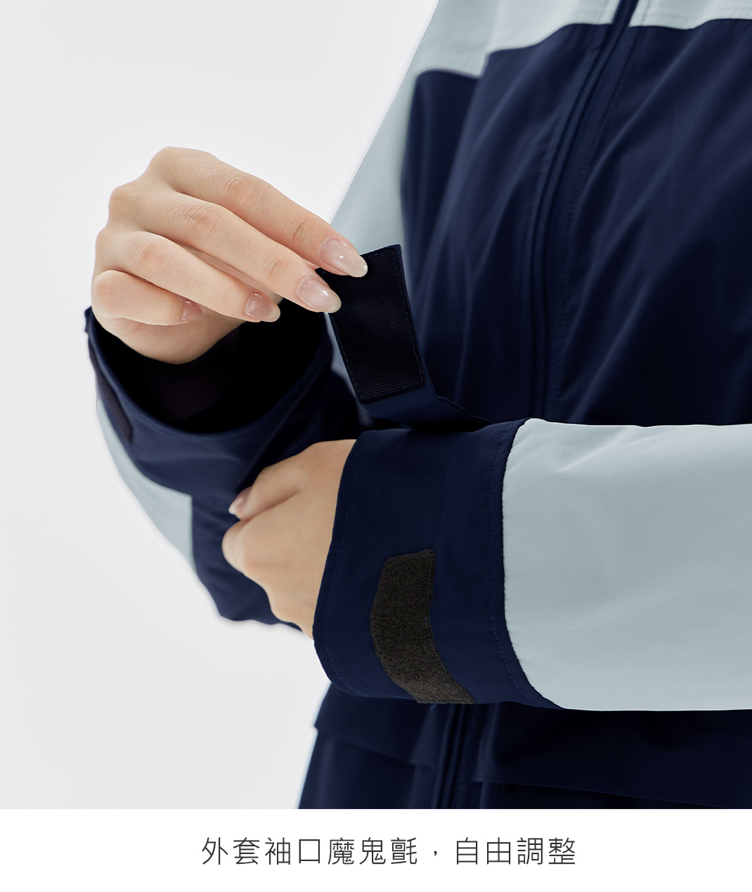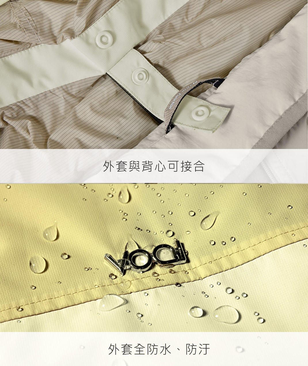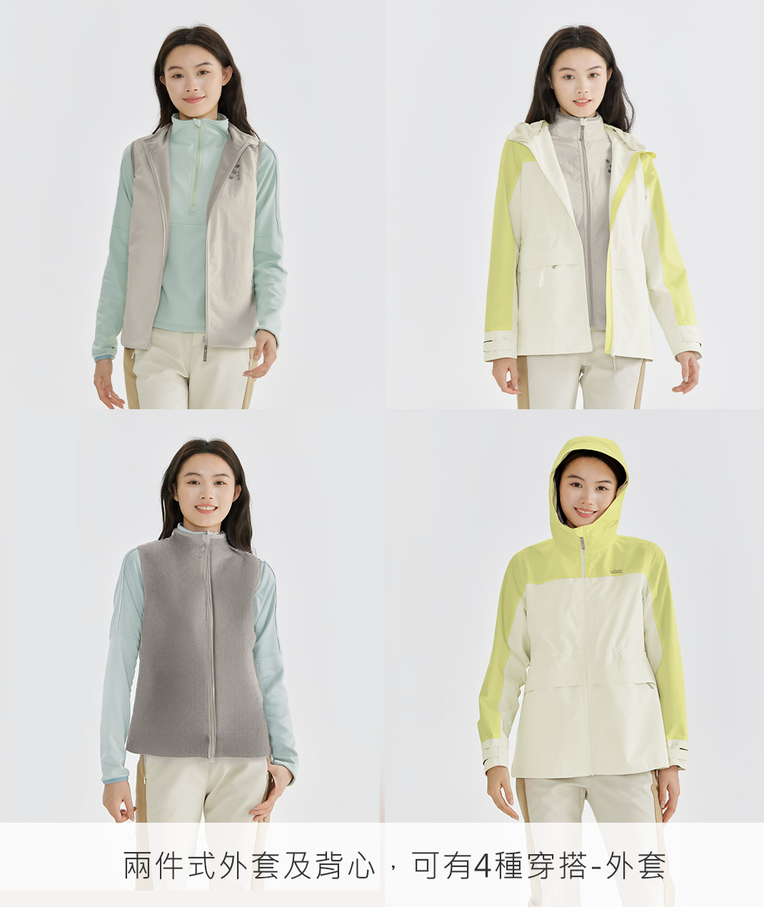 - 防水透濕環保兩件式修身外套,結合外套與雙面背心,可變化4種穿搭靈活應對氣候。外套全防水,帽內裡可拆,縮腰綁帶修飾身形,背心結合造型與保暖機能,附拉鍊口袋實用便利。