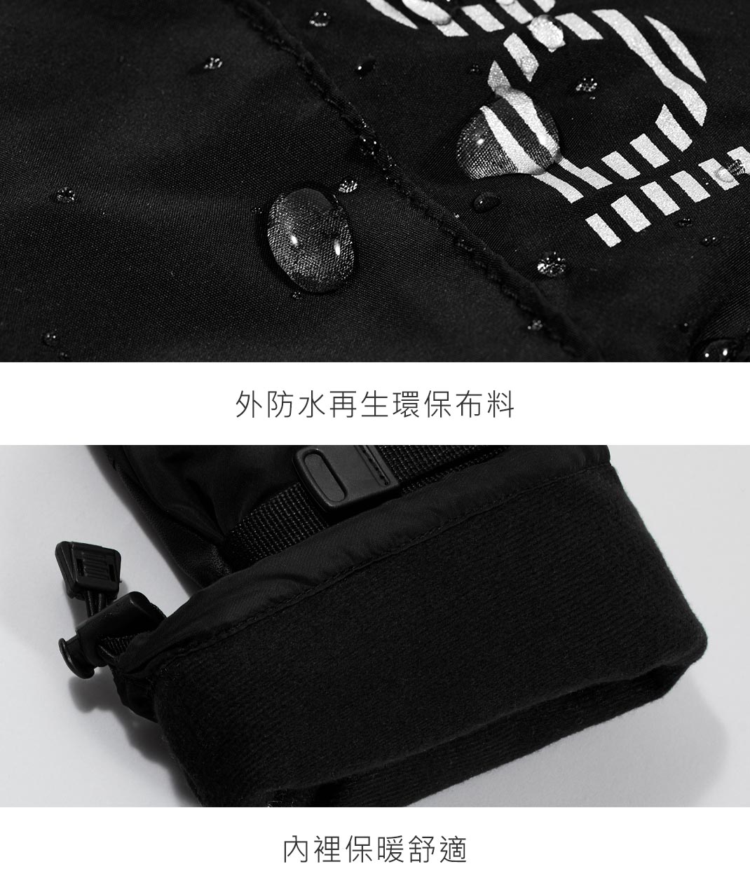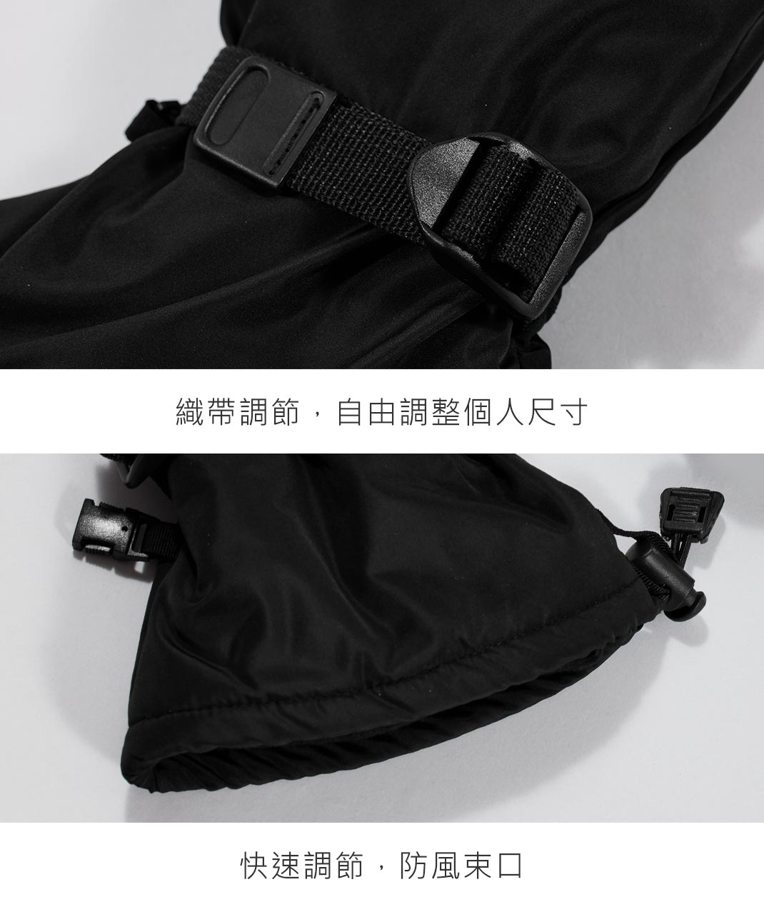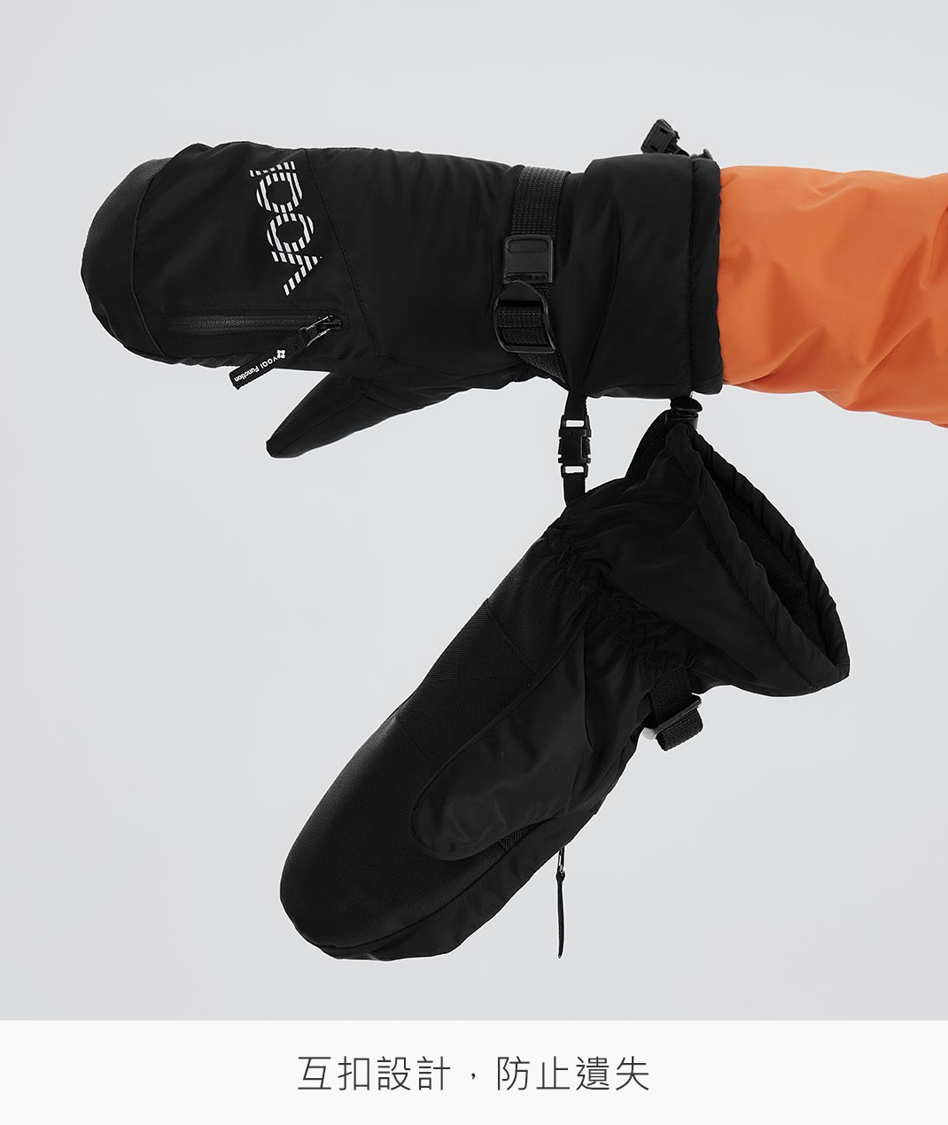 - 防水保暖可調式連指手套,內裏柔軟舒適,快速調節防風束口有效鎖溫。繫帶設計可依需求調整,掌心止滑增添抓握力,搭配反光LOGO提升夜間安全性,附防遺失母扣繩,滑雪登山皆適合。