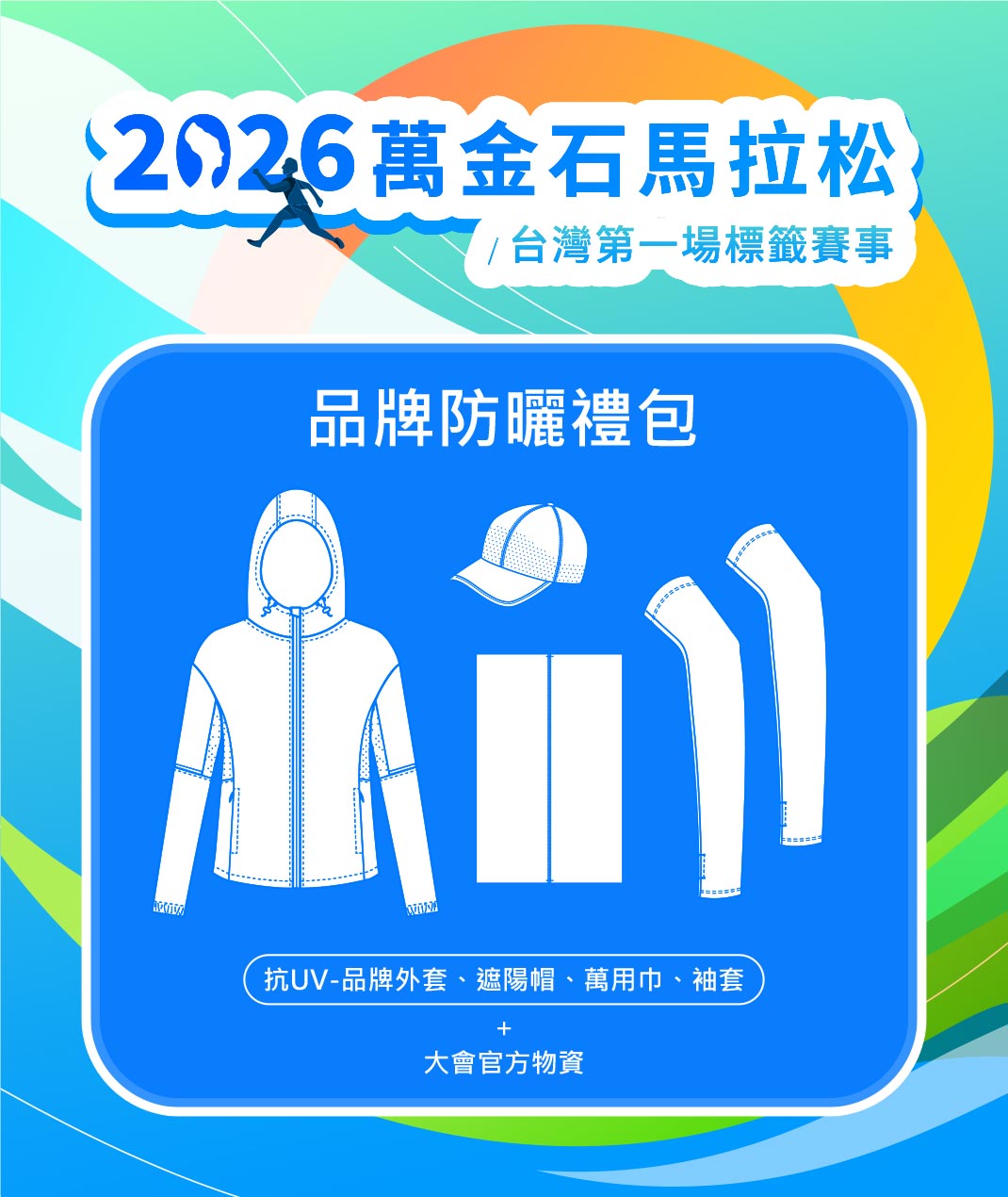 防曬禮包:抗UV-品牌外套、抗UV-品牌遮陽帽、抗UV-品牌萬用巾、抗UV-品牌袖套內容含大會參賽物資:如運動背心、號碼布、束口寄物袋、浴巾/毛巾、餐點、電子成績證明、獎牌。實際依主辦單位公告為主。